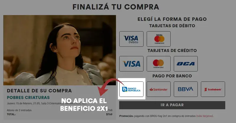 A partir de enero de 2024 cambiaron las condiciones de la promoción 2x1 con BROU en Cinemateca. Además de no aplicar para la tarjeta Maestro, ahora tampoco están habilitados para pre-pagas ni para pagos realizados por eBROU.